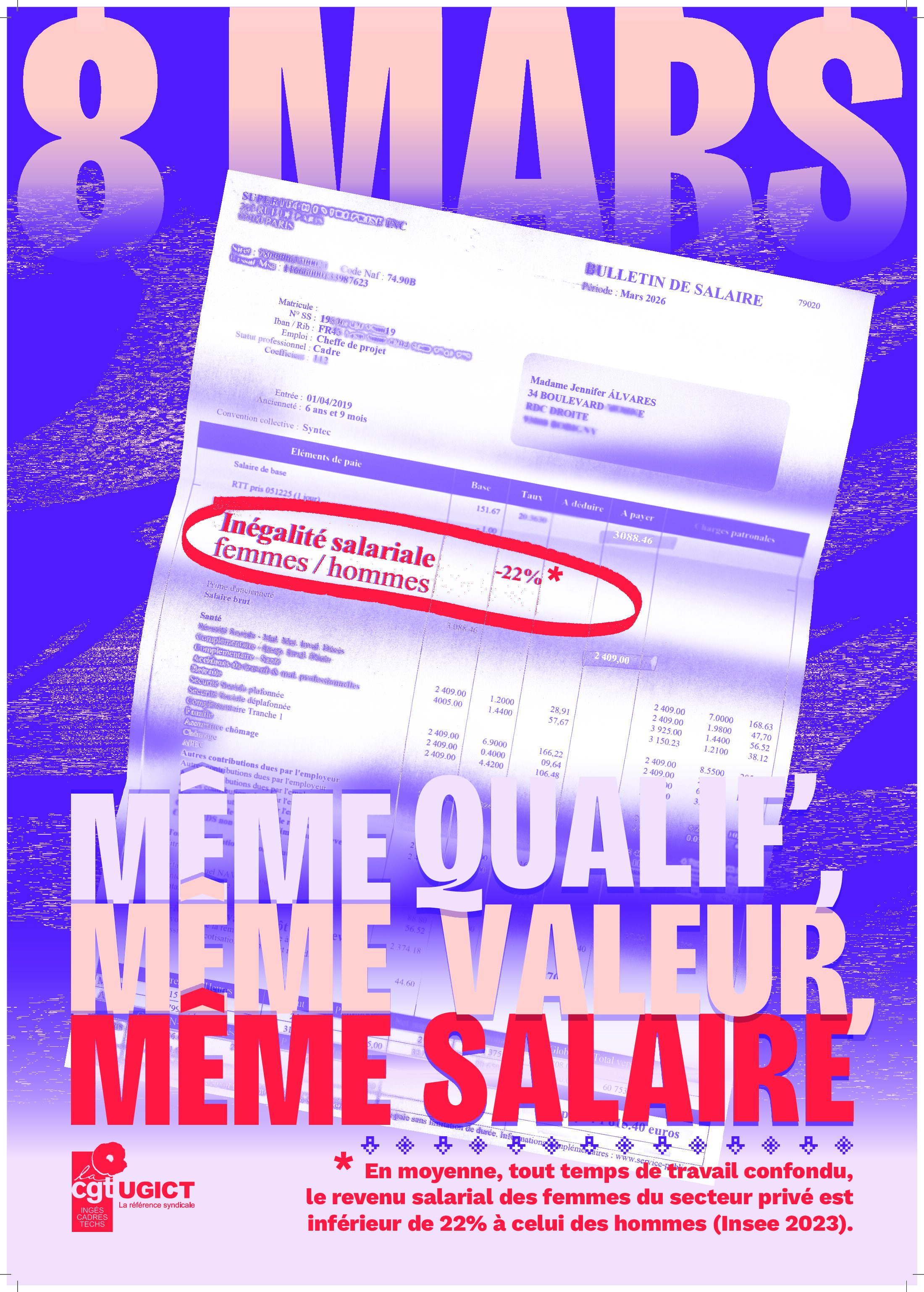 Syndiquées pour l'égalité ! À l'occasion du 8 mars, les ingés cadres techs CGT éditent 3 affiches de syndicalisation. Cette affiche générique de syndicalisation est disponible dans nos locaux.