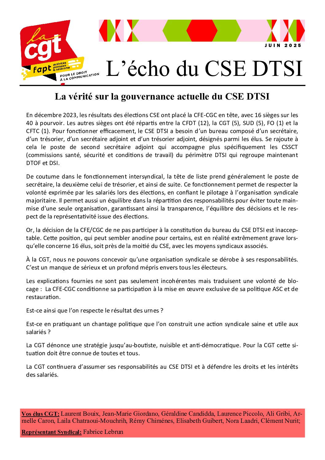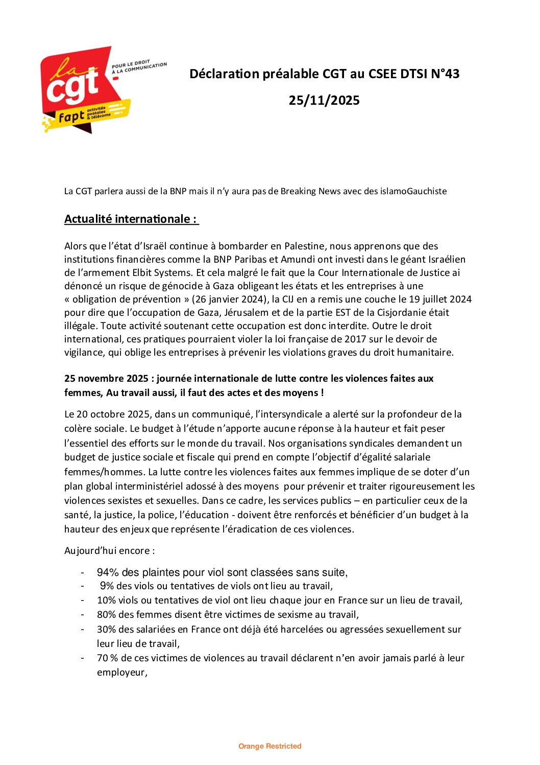 Déclaration préalable CGT CSE DTSI N°43 Novembre 2025